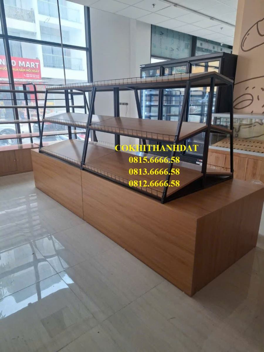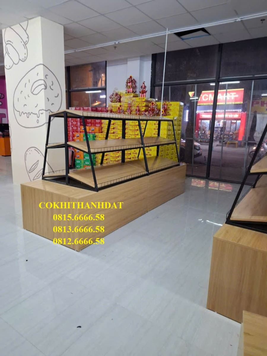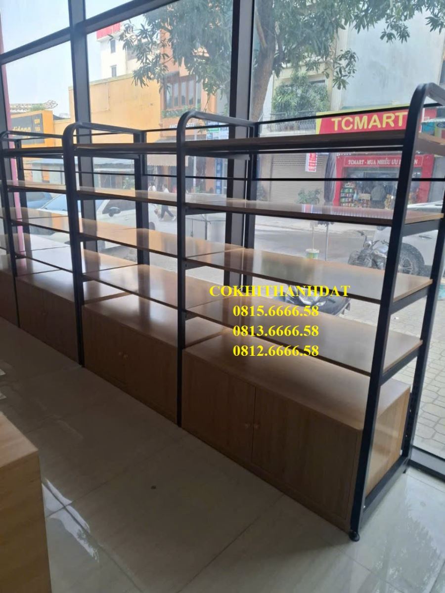 Mẫu kệ mà Thành Đạt thống nhất với anh Hùng lựa chọn đó là kệ khung sắt mâm gỗ với chất liệu khung sắt hộp cao cấp sơn tĩnh điện, mâm gỗ màu trầm dày dặn. Cụ thể, kệ đơn khung sắt mâm gỗ được đặt tại các vị trí áp sát tường của cửa hàng, kệ đôi đặt tại vị trí giữa cửa hàng để vừa trưng bày sản phẩm, vừa tạo lối đi cho khách hàng.