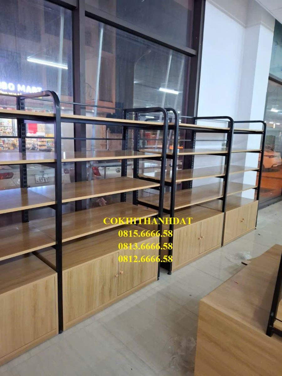 Ngoài ra, điểm đặc biệt của không gian lần này đó chính là những chiếc tủ kết hợp kệ đơn khung sắt mâm gỗ. Thay vì toàn bộ các tầng dùng để trưng bày sản phẩm thì mẫu sản phẩm này thiết kế tầng dưới cùng sẽ là ngăn tủ khép kín có cánh để mở ra, đóng vào. Đây sẽ là vị trí lưu trữ, cất giữ giấy tờ hoặc các sản phẩm dự trù cho các tầng kệ phía trên. Bằng sự sắp xếp tinh tế và kết hợp nhuần nhuyễn này, Thành Đạt hứa hẹn sẽ mang đến cho cửa hàng tiện lợi của anh Ngọc không gian kinh doanh đẹp mắt, ấn tượng , mang tính thẩm mỹ cao cùng sự hài hòa, cân đối nhất.