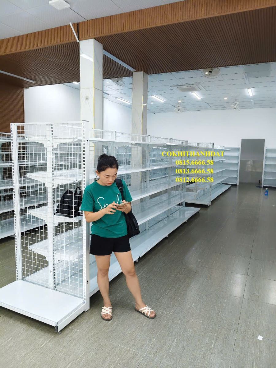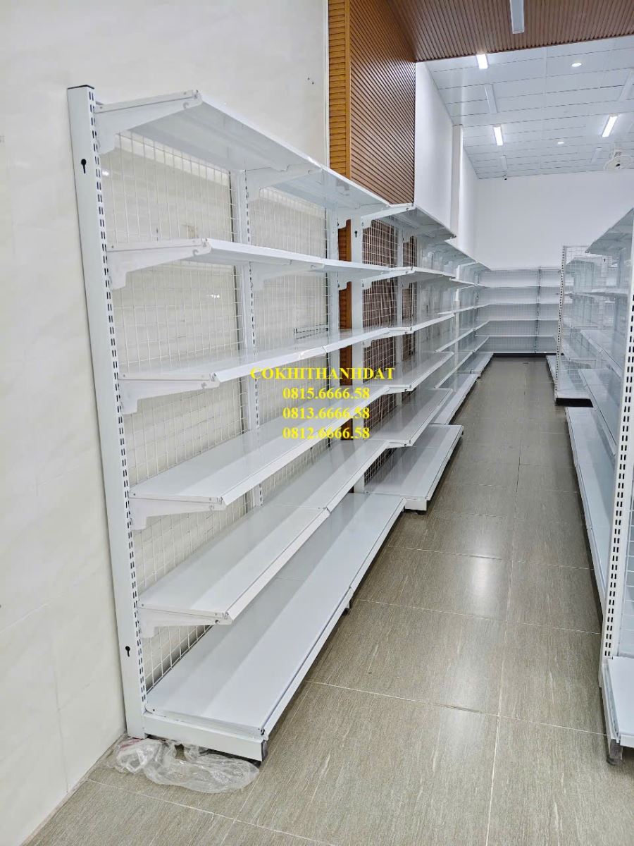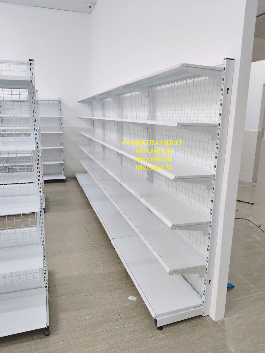 Thành Đạt đã đưa ra tư vấn cho chủ đầu tư sử dụng mẫu kệ đôi lưng lưới ở trung tâm cửa hàng. Đây là sản phẩm mang tính thẩm mỹ cao và có giá thành rất hợp lý do chi phí sản xuất nguyên liệu thấp. Mẫu kệ này được thiết kế đơn giản với các bộ phận tách rời, giúp việc vận chuyển và lắp đặt trở nên dễ dàng và tiện lợi. Với gam màu chủ đạo là trắng , kệ siêu thị trở nên thanh lịch và làm sáng bừng không gian kinh doanh. Kệ có 2 mặt bày hàng, thiết kế độc đáo vẫn đảm bảo lối đi rộng rãi, thoáng đãng.