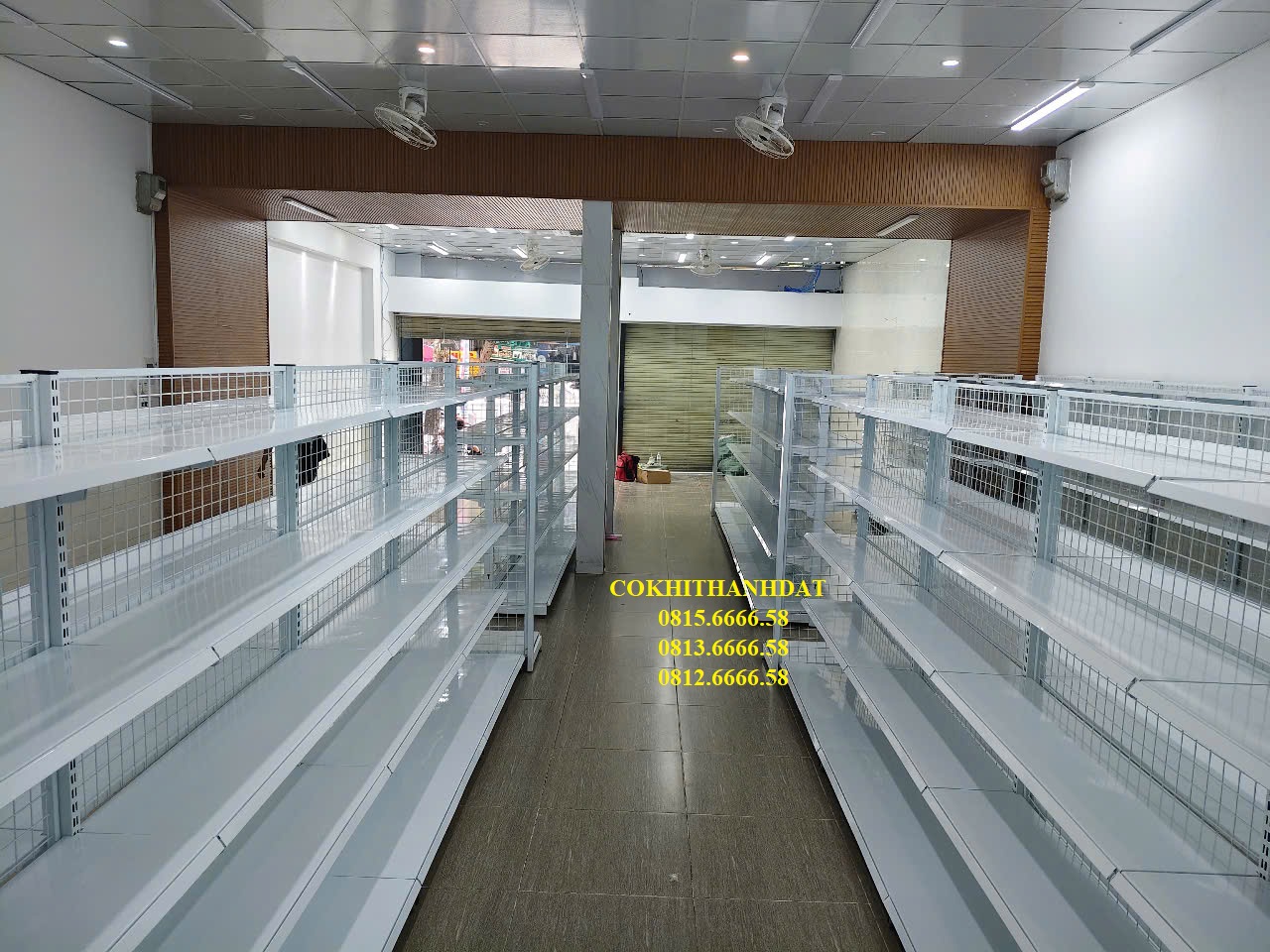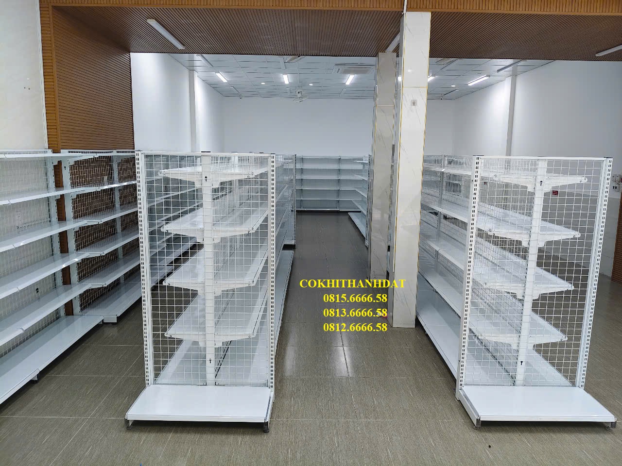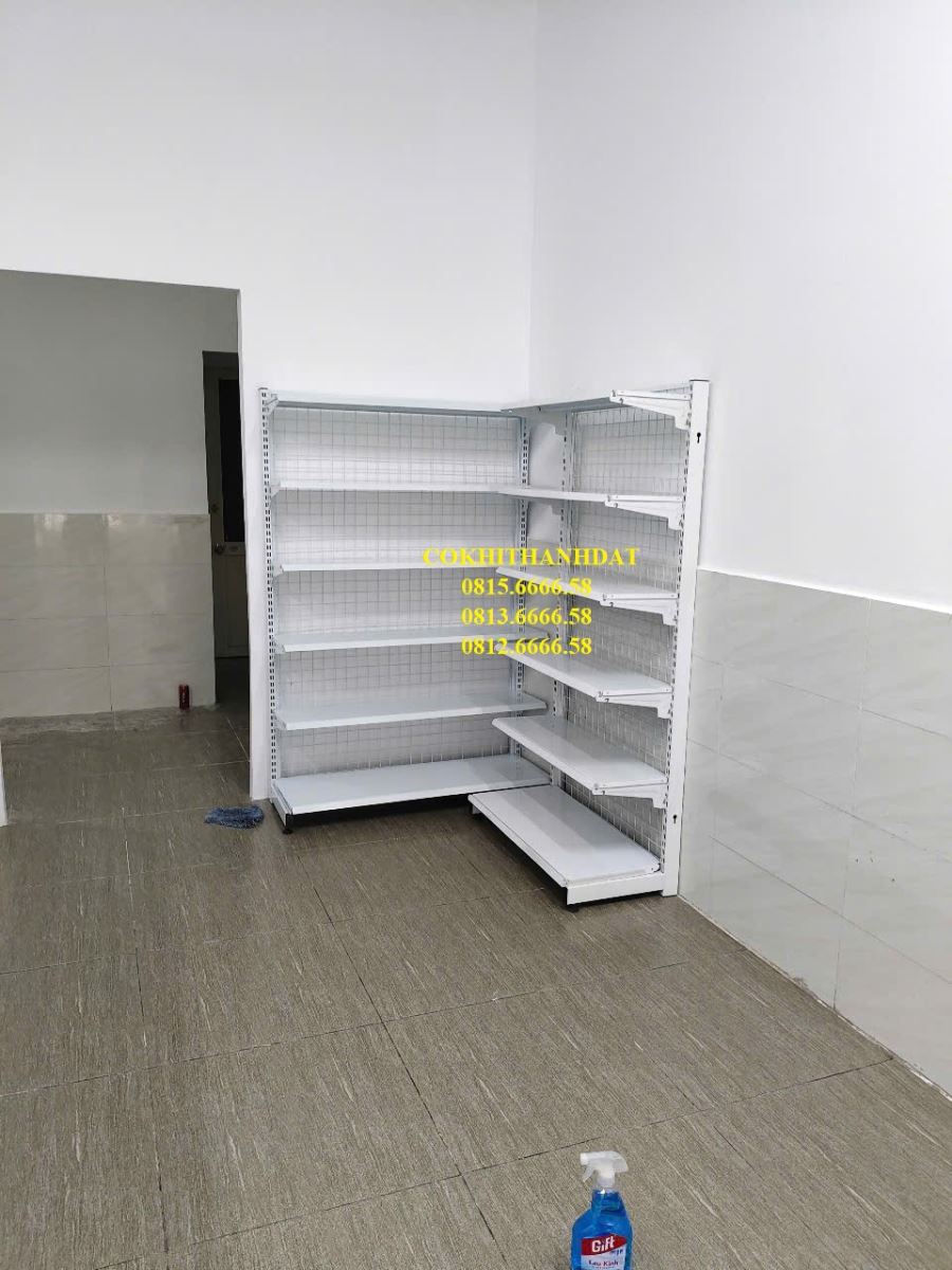Thành Đạt đã đưa ra tư vấn cho chủ đầu tư sử dụng mẫu kệ đôi lưng lưới ở trung tâm cửa hàng. Đây là sản phẩm mang tính thẩm mỹ cao và có giá thành rất hợp lý do chi phí sản xuất nguyên liệu thấp. Mẫu kệ này được thiết kế đơn giản với các bộ phận tách rời, giúp việc vận chuyển và lắp đặt trở nên dễ dàng và tiện lợi. Với gam màu chủ đạo là trắng , kệ siêu thị trở nên thanh lịch và làm sáng bừng không gian kinh doanh. Kệ có 2 mặt bày hàng, thiết kế độc đáo vẫn đảm bảo lối đi rộng rãi, thoáng đãng.